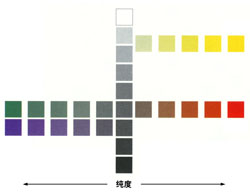 在彩色系中,黄色为最明亮的色,明度最高,在光谱中处于中心位置。紫色为明度最低的色,处于光谱的边缘。各种色彩都可以通过加白或黑色作明度色阶变化。